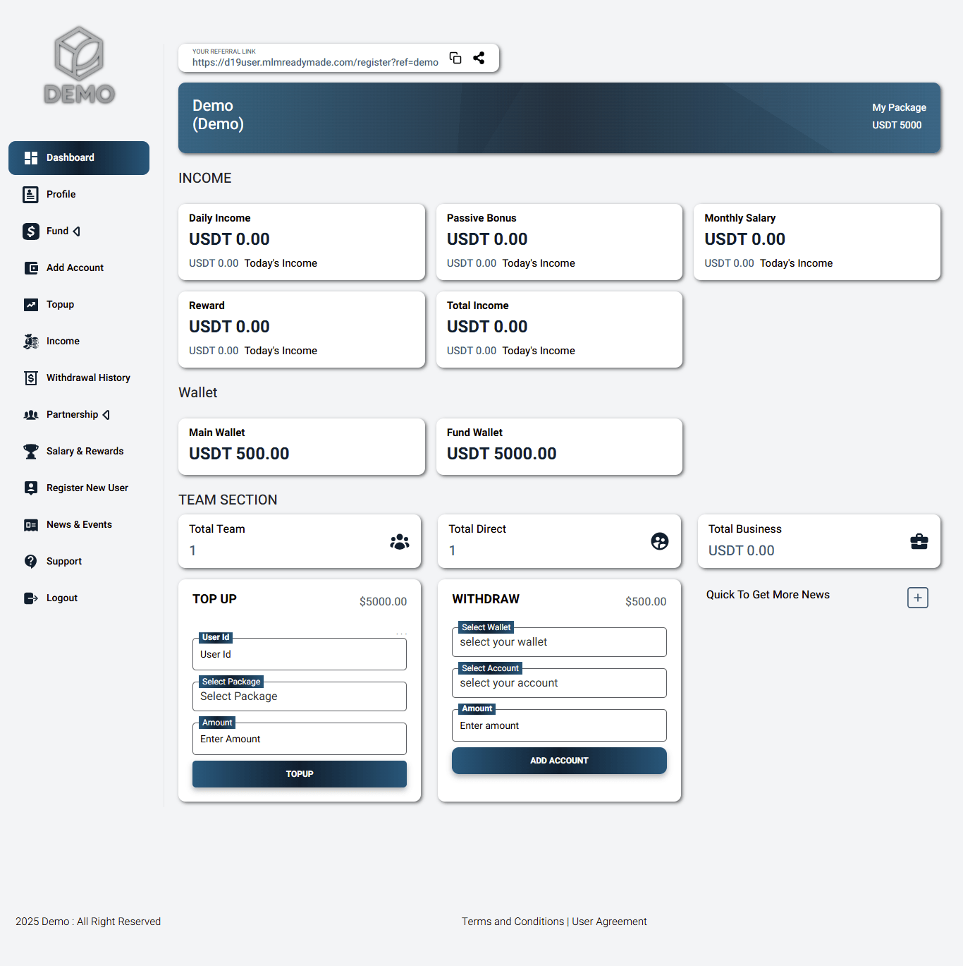 You can start making money from day one with MLM Software With Demo. Get instant access to an exclusive community full of platform users who are already making money every single day. Let our experts provide the features most suited for your needs so that auto-pilot success is not so hard to reach!